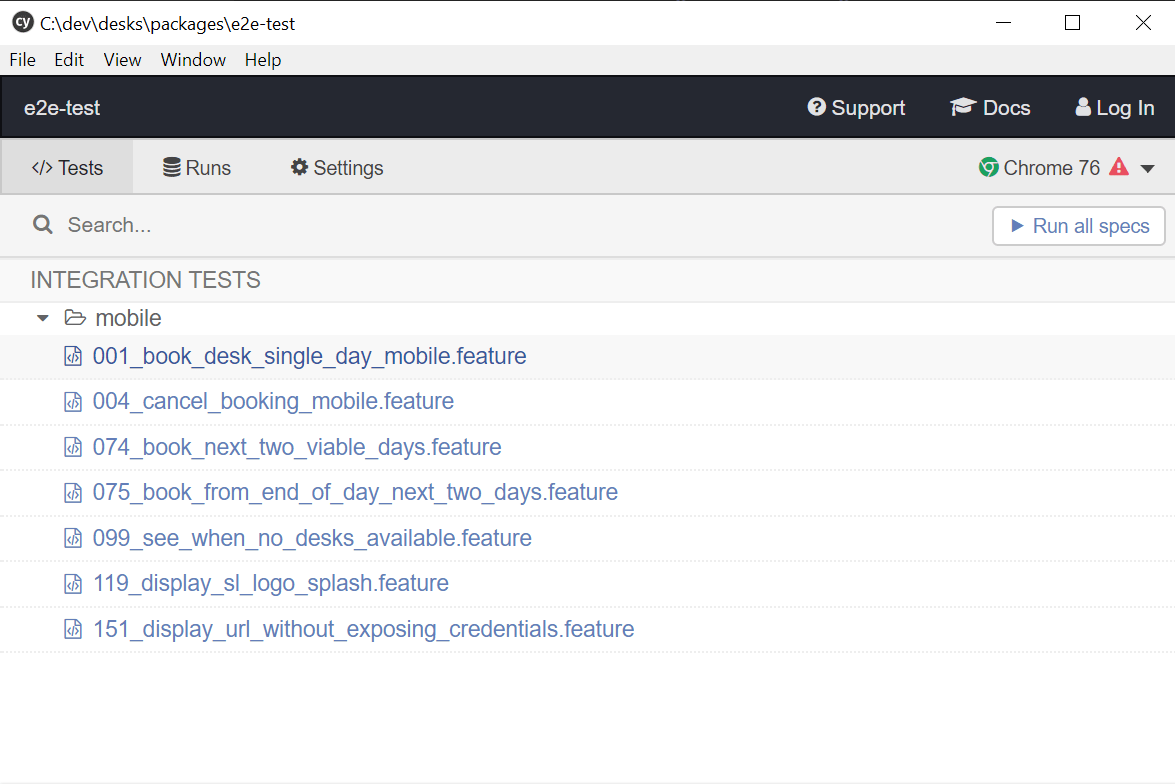 By default, Cypress expects to see your end-to-end test files in its “integration/” folder. Not sure why it’s the “integration” folder, but it is what it is. I copy-pasted the story from the GitHub project into a new file. I commented out the text to use as reference and saved the file as “book_desks.feature”. The name is important so please take note of it.